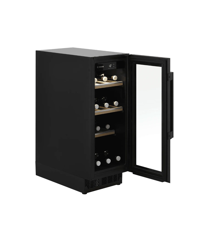 The Bosch KUW20VHF0G wine refrigerator holds up to 21 bottles between two wine glasses. It features digital temperature control, UV-resistant glass, and LED kitchen lighting, making it an ideal choice for sharing in any space, room, or space.