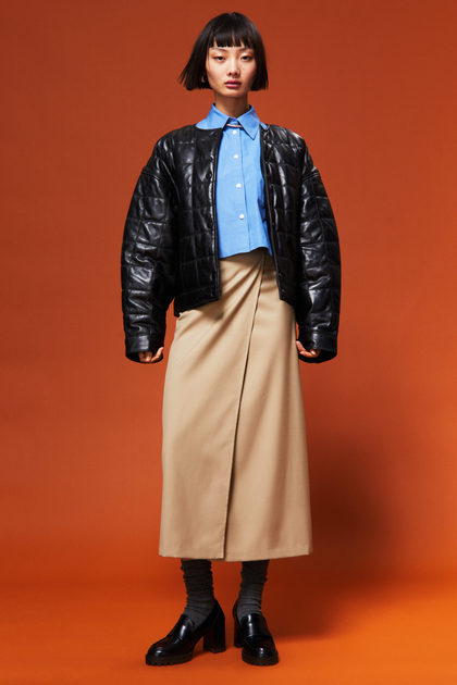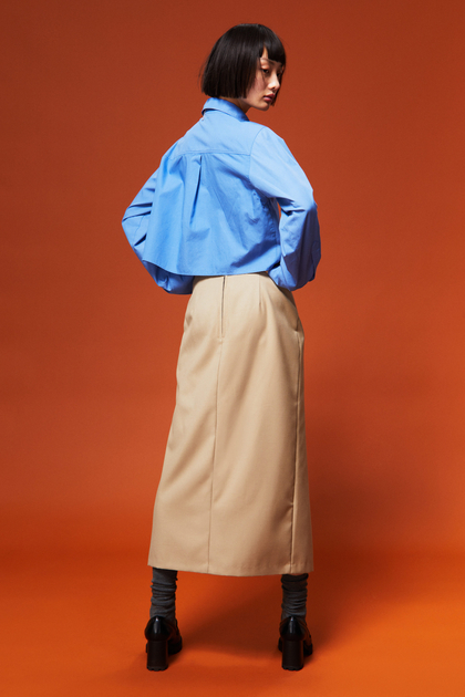 تنورة بطول ربلة الساق من نسيج فيسكوز بخصر مرتفع ، وسحاب مخفي من جانب واحد وفتحة عالية في الأمام. غير مُبطنة.