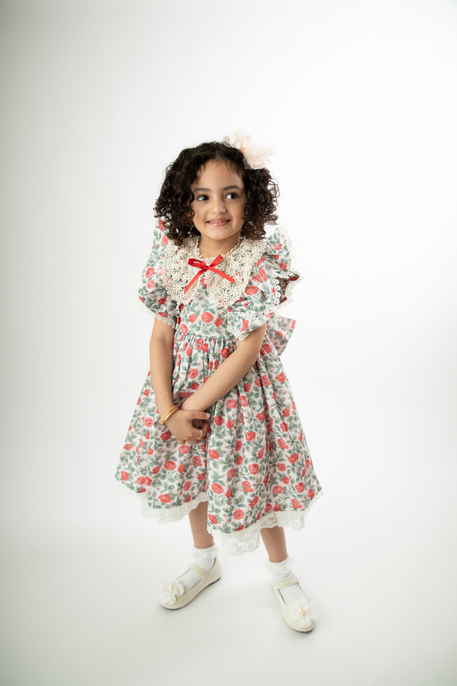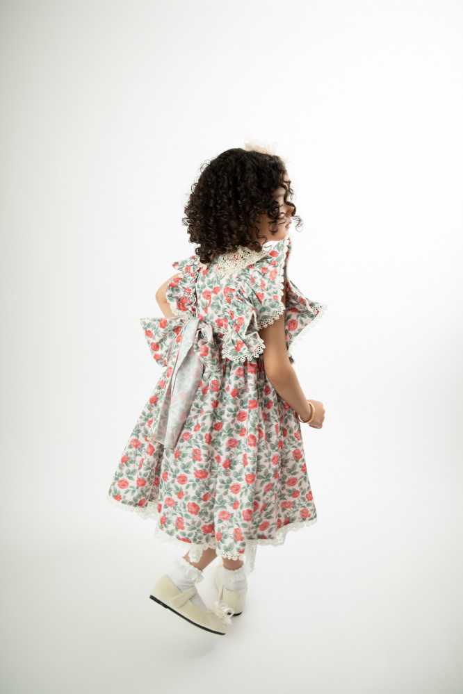 فستان بناتي بتفاصيل طبعة وفيونكه